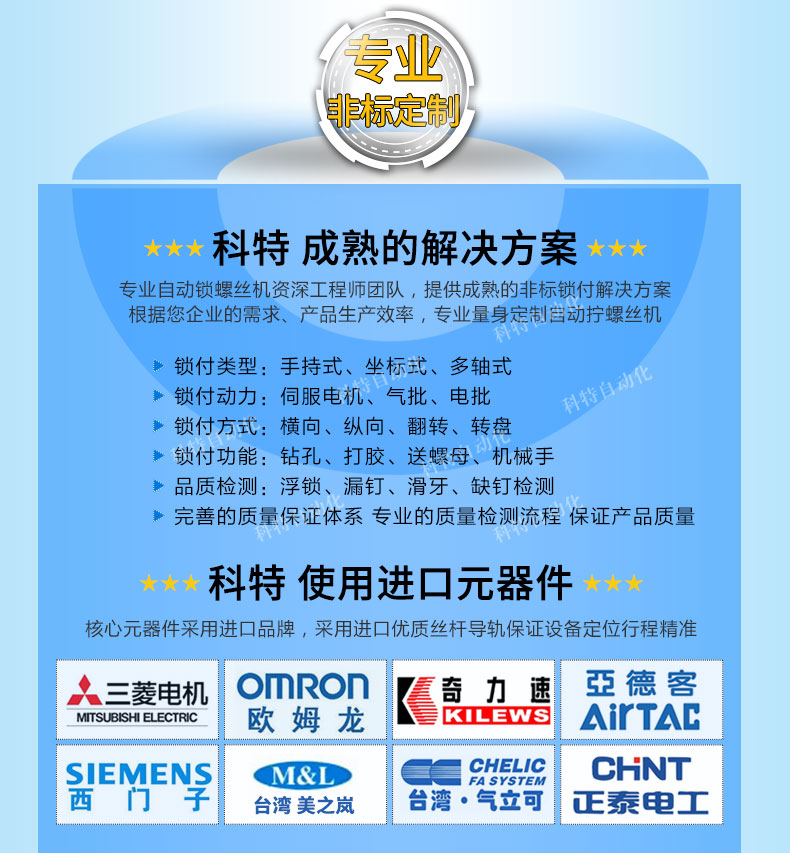 歡迎光臨科特自動(dòng)化官網(wǎng),專注自動(dòng)鎖螺絲機(jī)設(shè)備研發(fā)、生產(chǎn)、銷售! 關(guān)于我們| 視頻展示| 聯(lián)系我們