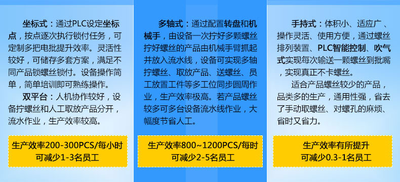 慧晶自動(dòng)化為解決上述問題為廠家設(shè)計(jì)了一臺(tái)多工位多軸式自動(dòng)鎖螺絲機(jī),工作臺(tái)上設(shè)立了多個(gè)工位多把電批同時(shí)運(yùn)轉(zhuǎn)鎖付,通過送螺絲機(jī)構(gòu)進(jìn)行螺絲的輸送,上下運(yùn)動(dòng)裝置接觸螺絲,然后通過鎖螺絲機(jī)構(gòu)對(duì)產(chǎn)品進(jìn)行鎖螺絲作業(yè),大大提高了工作效率,可以實(shí)現(xiàn)快速的鎖螺絲作業(yè),特別適用于批量作業(yè),同時(shí)通過電機(jī)的扭力控制,避免了螺絲欠品和浮鎖現(xiàn)象,保證產(chǎn)品質(zhì)量,省時(shí)省力,節(jié)約生產(chǎn)工時(shí),降低企業(yè)的生產(chǎn)成本。